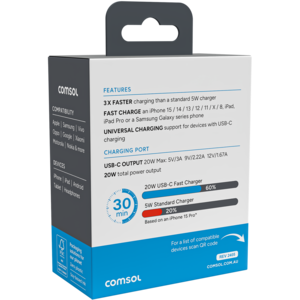 AC20CB Part No. AC20CB Warranty:2 years Please login to view pricing & stock level Ideal ForiPhoneiPadAndroidTabletHeadphonesCharging Ports1x USB-COutputUSB-C Output 20W Max: 5V/3A | 9V/2.22A | 12V/1.67A Details 3 X FASTERCharging than a standard 5W chargerFAST CHARGEAn iPhone 16 / 15 / 14 / 13 / 12 / 11 / X / 8, iPad, iPad Pro or a Samsung Galaxy series phone... DetailsBackDetails3 X FASTERCharging than a standard 5W chargerFAST CHARGEAn iPhone 16 / 15 / 14 / 13 / 12 / 11 / X / 8, iPad, iPad Pro or a Samsung Galaxy series phoneUNIVERSAL CHARGINGSupport for devices with USB-C charging