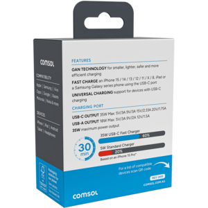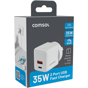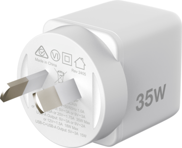 AC35CAW Part No. AC35CAW Warranty:2 years Please login to view pricing & stock level Ideal ForGalaxyiPhoneiPadAndroidTabletCharging Ports1x USB-COutputUSB-C - 35W Max: 5V/3A | 9V/3A | 15V/2.33A | 20V/1.75A USB-A - 18W Max: 5V/3A | 9V/2A | 12V/1.5A35W Maximum Power Output Details GAN TECHNOLOGYFor smaller, lighter, safer and more efficient chargingFAST CHARGEAn iPhone 16 / 15 / 14 / 13 / 12 / 11 / X / 8, iPad or a Samsung Galax... DetailsBackDetailsGAN TECHNOLOGYFor smaller, lighter, safer and more efficient chargingFAST CHARGEAn iPhone 16 / 15 / 14 / 13 / 12 / 11 / X / 8, iPad or a Samsung Galaxy series phone using the USB-C portUNIVERSAL CHARGINGSupport for devices with USB-C charging