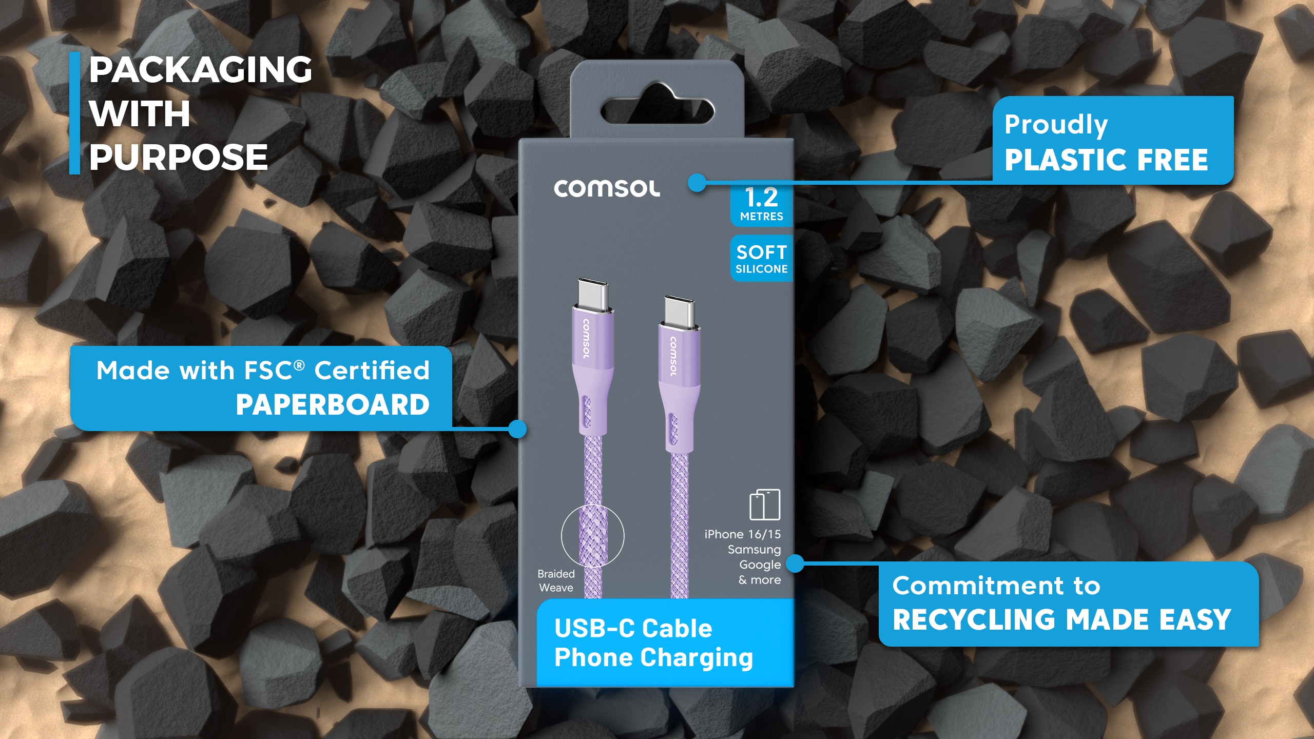 Comsol 1.2m USB-C to USB-C Soft Silicone & Fabric Charge & Sync Cable