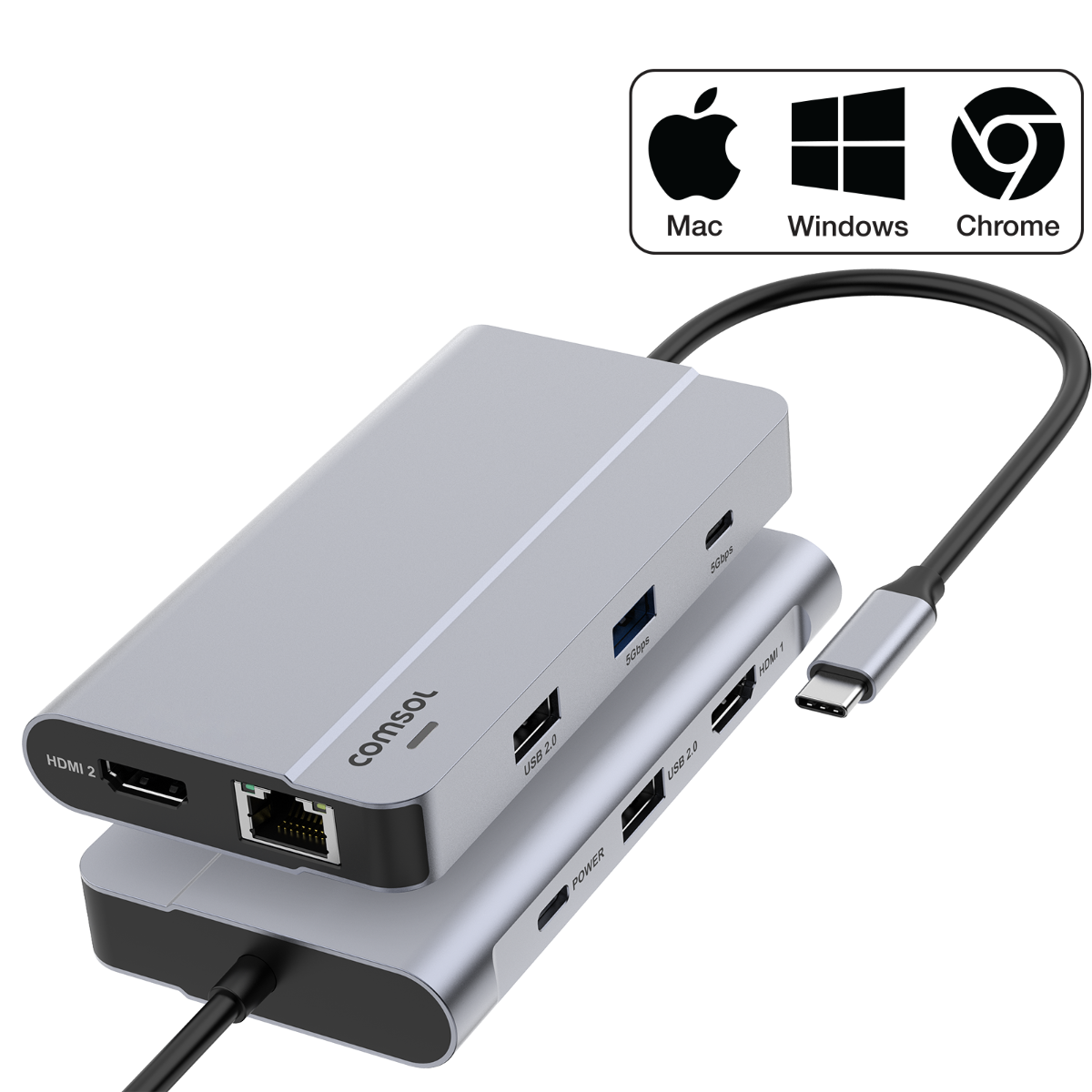 Expansion Ports: USB-C Male, USB-C Power Port, USB-A 2.0 Data Ports, HDMI Port 1 Silicon Motion, HDMI Port 2 DP Alt Mode, RJ45 Gigabit LAN, USB-A 3.2 Data Port, USB-C 3.2 Data Port