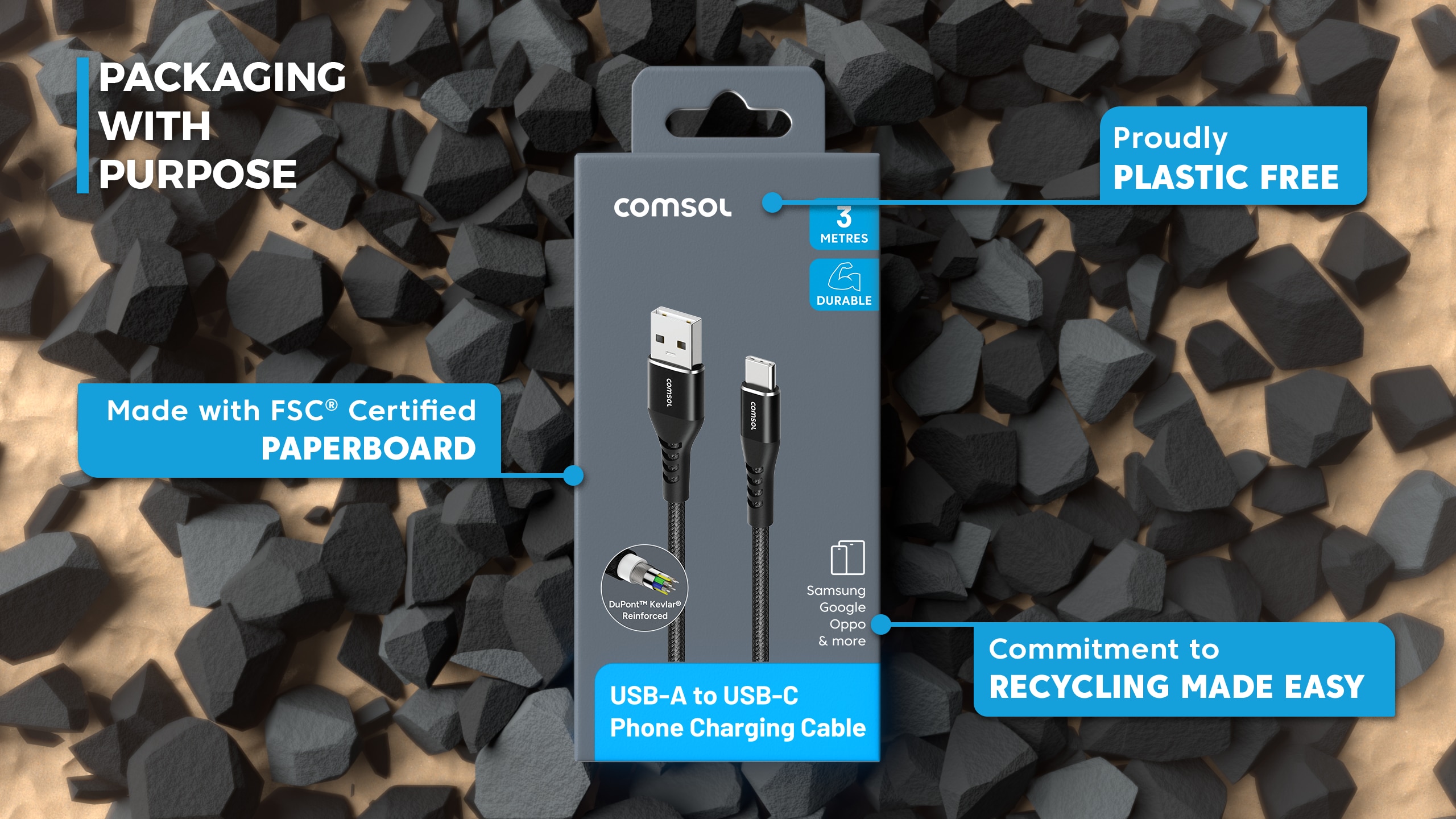 3m USB-A to USB-C Cable Reinforced with Aramid Fibre - Black