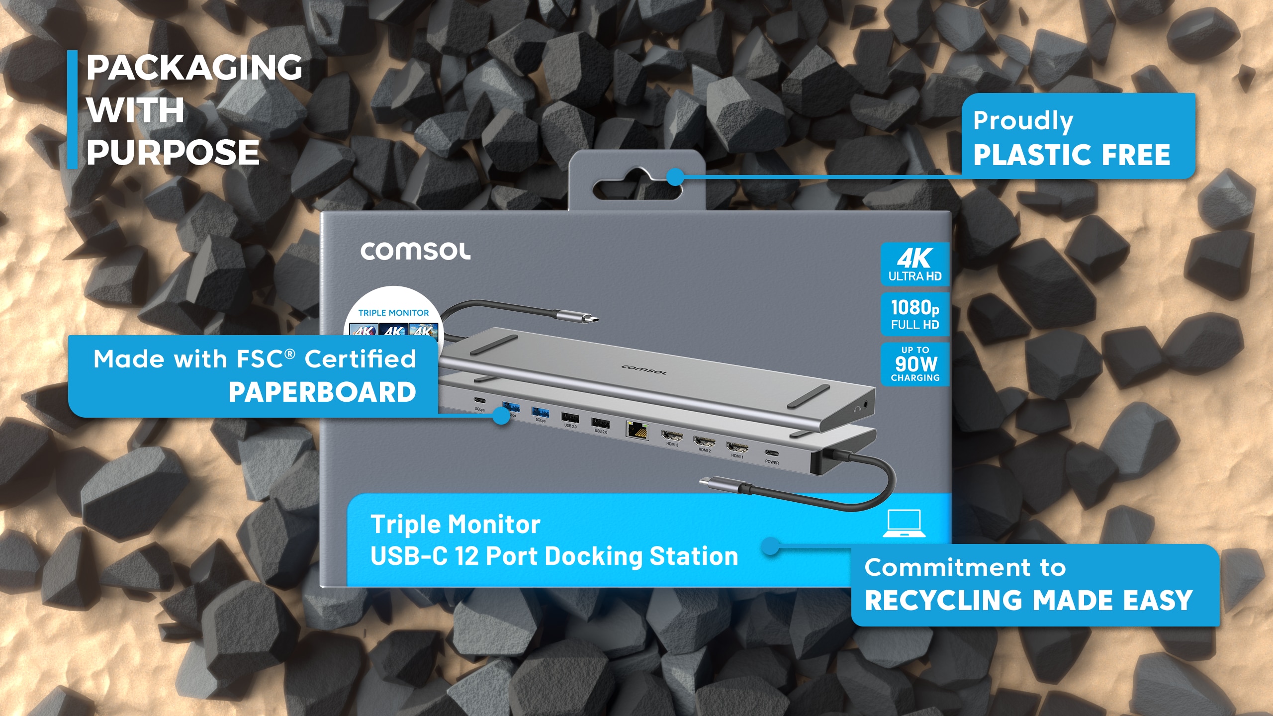 A: On the box you will note that this 3 x 4K display message reference is what the docking station is capable of achieving, your laptop must also be able to to support this feature. If your laptop can only support DisplayPort 1.2 this dock can only support 3 x 1080p Full HD screens, your laptop must have DisplayPort 1.4 with DSC (Display Stream Compression) to achieve 3 x 4K displays with this docking station. Please refer to the laptop and dock’s user manuals for more information. Feel free to also contact Comsol support for more information