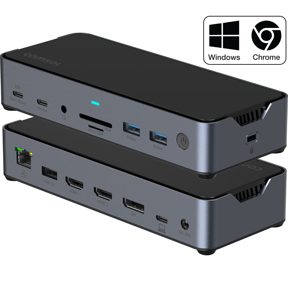 Expansion Ports: USB-C Data PD 30W Charge Port, USB-C 10Gbps Data Port, 3.5mm Audio Socket, SD Card/microSD Card, 2 x USB-A 5Gbps Data Ports, Power Button, Security Slot, RJ45 Gigabit LAN, USB-A 2.0 Port, 2 x HDMI Ports, DisplayPort Port, USB-C Host Port, DC Power Input
