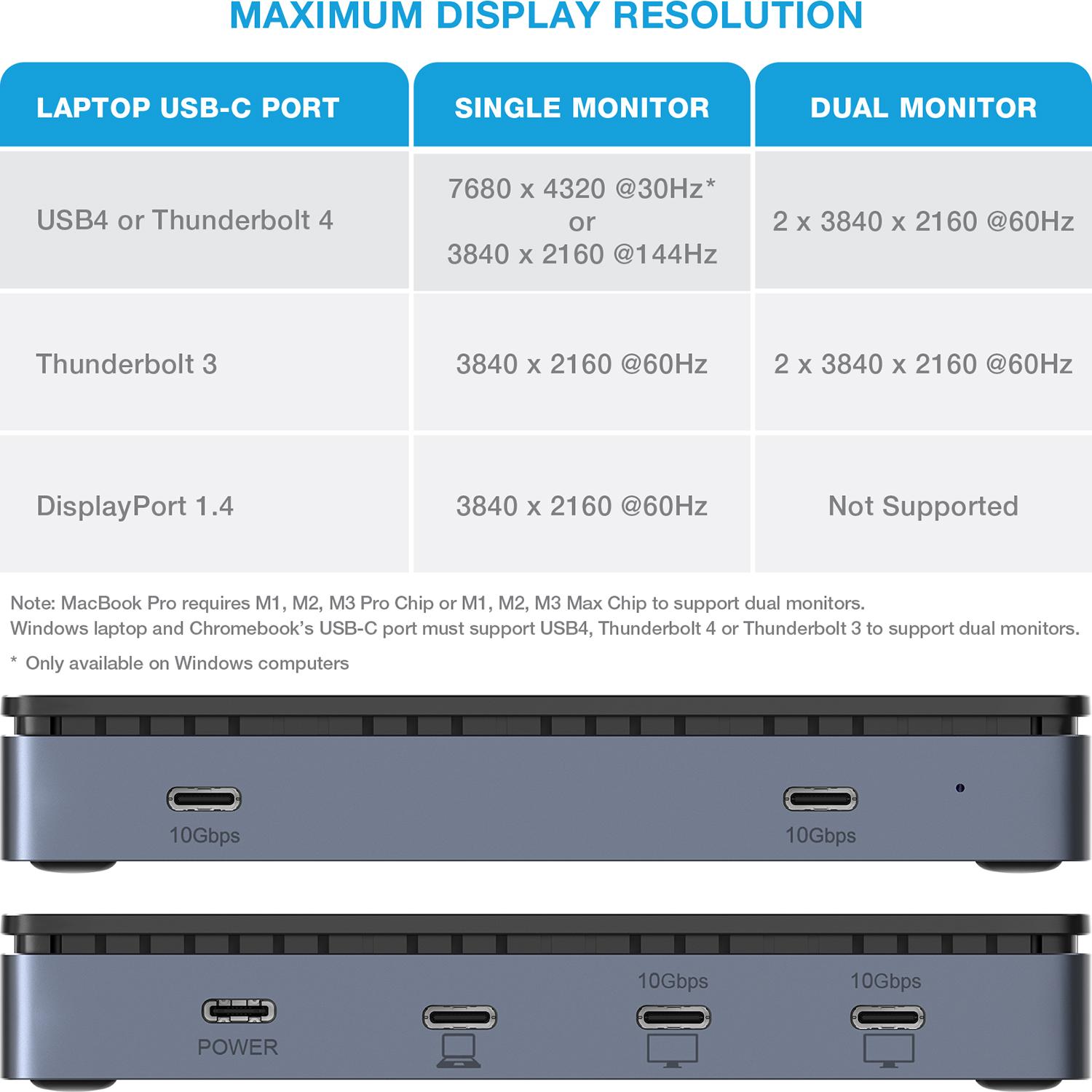 Monitors require a USB-C to HDMI or USB-C to DisplayPort cable or adapter (not included)